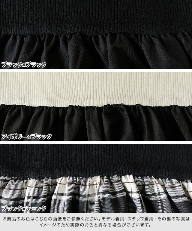 トップス部分は、柔らかく滑らかな着心地のレーヨン混素材を使用。細めのリブ編みが上品な印象をプラスします。スカート部分は、さらっとした程良く厚みのある素材を使用した異素材使いがポイントです。