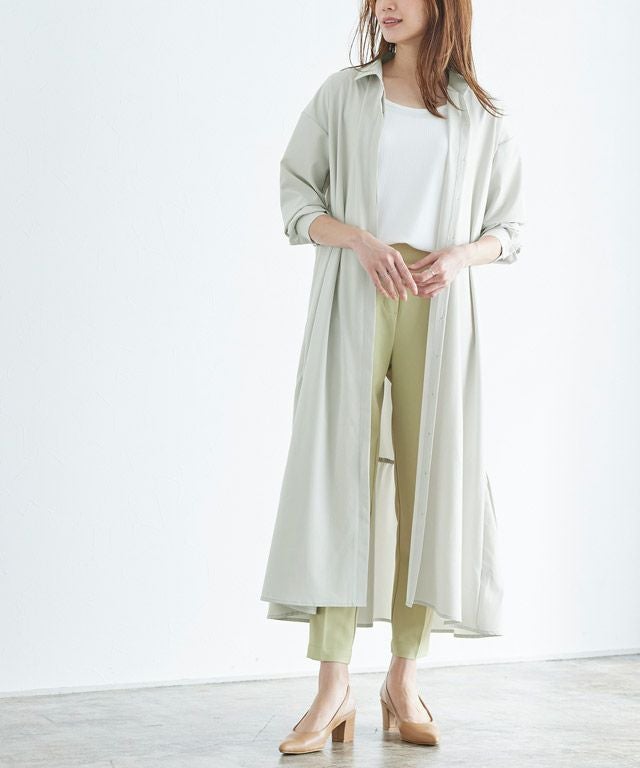 I 着丈は足首下の丈感です。丈が長いのでヒールを履くことをおすすめします。袖丈は手の甲が隠れる長さです。全体的にゆとりがありボリュームのあるシルエットです。さらっとした素材で軽い着心地です。