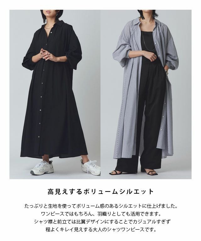 たっぷりと生地を使ってボリューム感のあるシルエットに仕上げました。ワンピースではもちろん、羽織りとしても活用できます。シャツ襟と前立ては比翼デザインにすることでカジュアルすぎず程よくキレイ見えする大人のシャツワンピースです。デイリーシーンはもちろん、リゾートシーンでもかさばらず、持ち運びにも適した一枚。