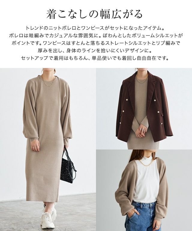 トレンドのニットボレロとワンピースがセットになったアイテム。ボレロは畦編みでカジュアルな雰囲気に。ぽわんとしたボリュームシルエットがポイントです。ワンピースはすとんと落ちるストレートシルエットとリブ編みで厚みを出し、身体のラインを拾いにくいデザインに。セットアップで着用はもちろん、単品使いでも着回し自由自在です。