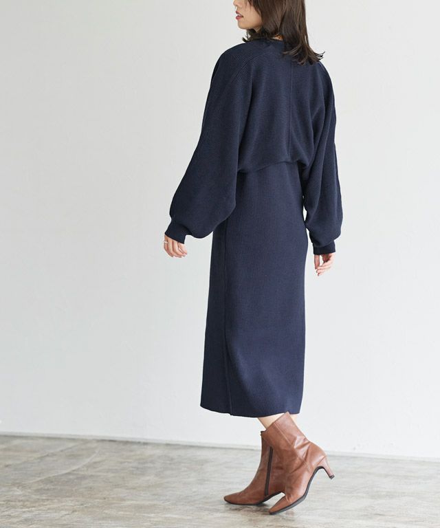 トレンドのニットボレロとワンピースがセットになったアイテム。ボレロは畦編みでカジュアルな雰囲気に。ぽわんとしたボリュームシルエットがポイントです。ワンピースはすとんと落ちるストレートシルエットとリブ編みで厚みを出し、身体のラインを拾いにくいデザインに。セットアップで着用はもちろん、単品使いでも着回し自由自在です。