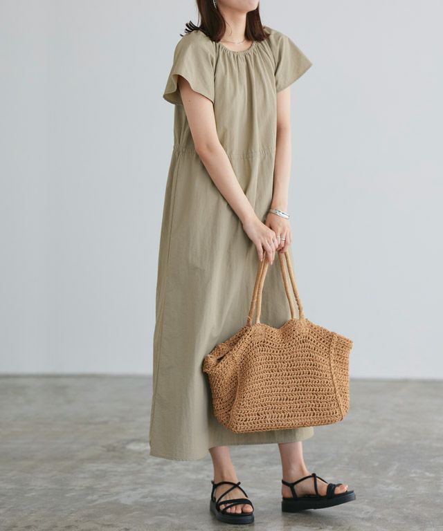 N 着丈はふくらはぎ下の丈感でした。袖丈は二の腕が3分の1隠れます。身幅は程よいゆとりがありました。さらっとした素材で程よくハリ感があります。ウエストはドロスト仕様で調整できるので、シチュエーションに合わせて着まわせます。