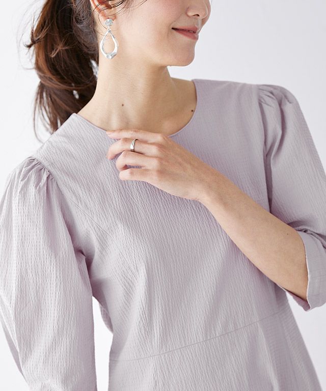 リップル生地特有の凹凸のある素材感がシーズンムードを高めるアイテム。程よくハリ感があるのできれいなシルエットを作り出します。