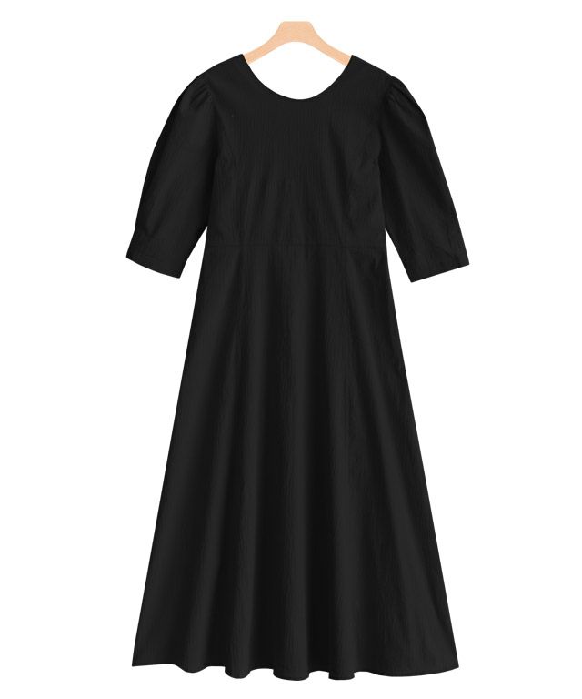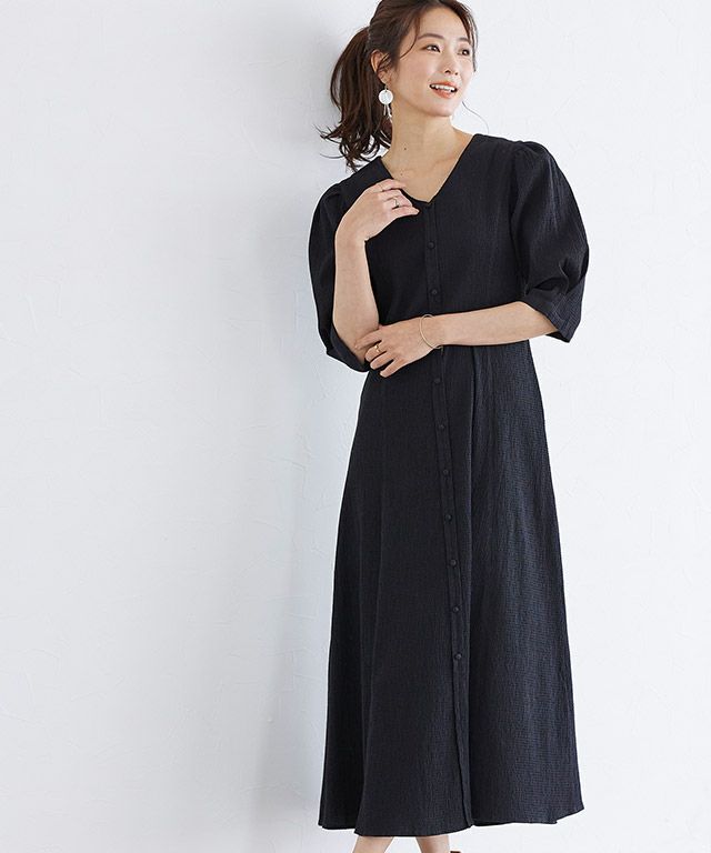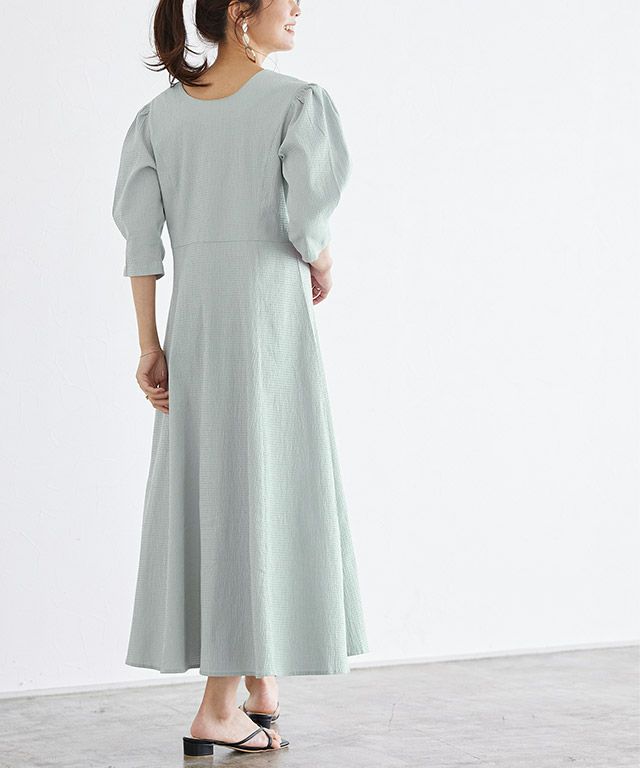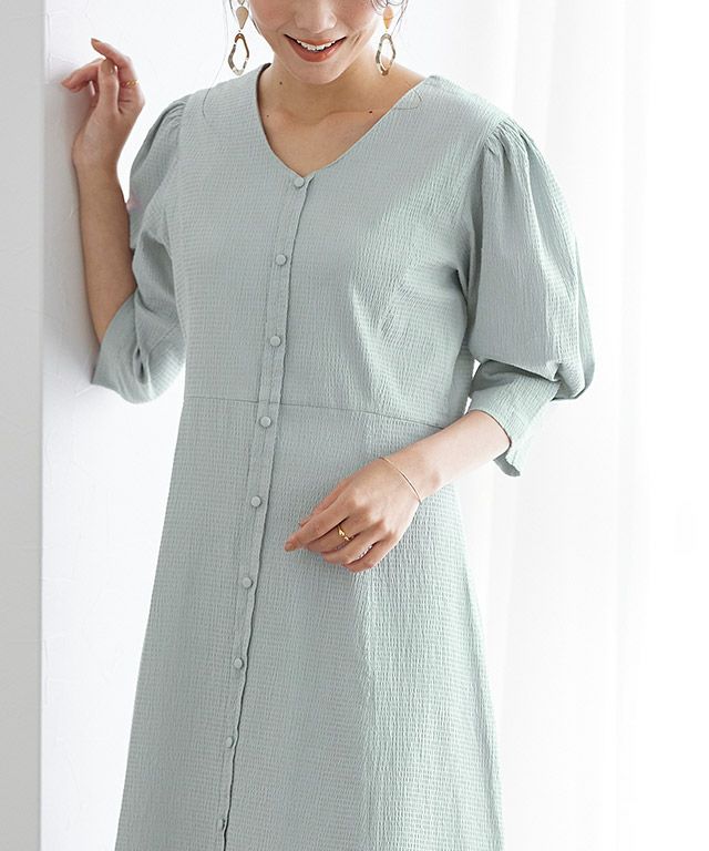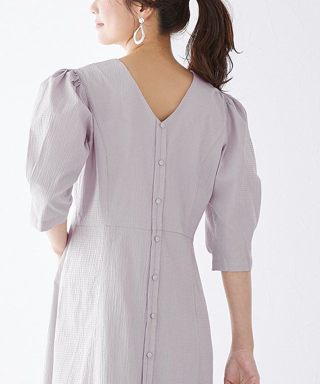 パフスリーブとフレアラインがフェミニン要素たっぷりのワンピース。細かなディテール使いでこだわりの詰まった一枚です。バックボタンとフロントボタンの2wayで着られるので、気分によってスタイリングを楽しめます。