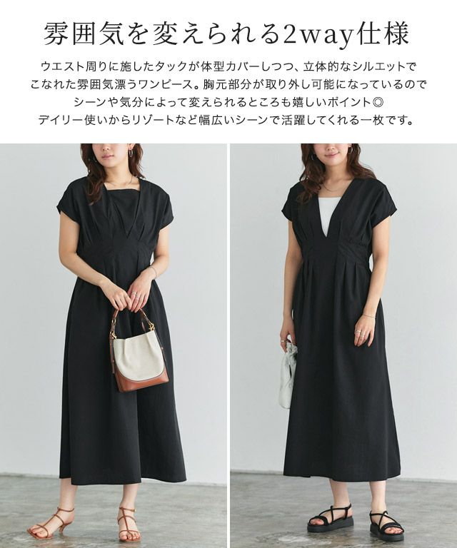 ウエスト周りに施したタックが体型カバーしつつ、立体的なシルエットでこなれた雰囲気漂うワンピース。胸元部分が取り外し可能になっているのでシーンや気分によって変えられるところも嬉しいポイント◎デイリー使いからリゾートなど幅広いシーンで活躍してくれる一枚です。