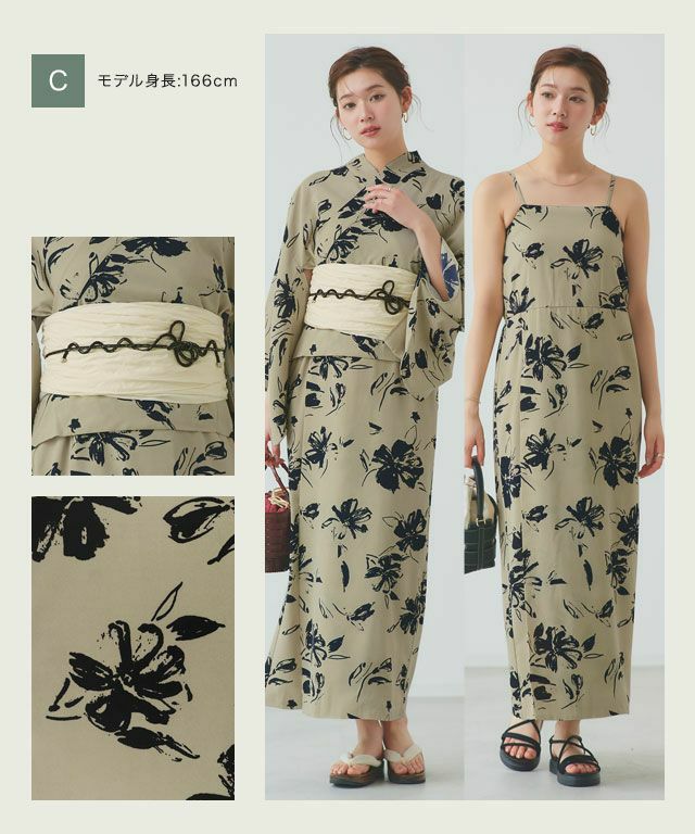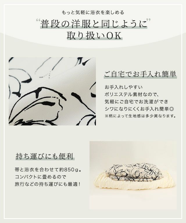 ワンピース型で洋服感覚で簡単に着られる新感覚な一枚。浴衣としてはもちろん、ワンピース単体で着られるところが魅力。浴衣としての着用とまた違った印象で普段着としても着回せます。