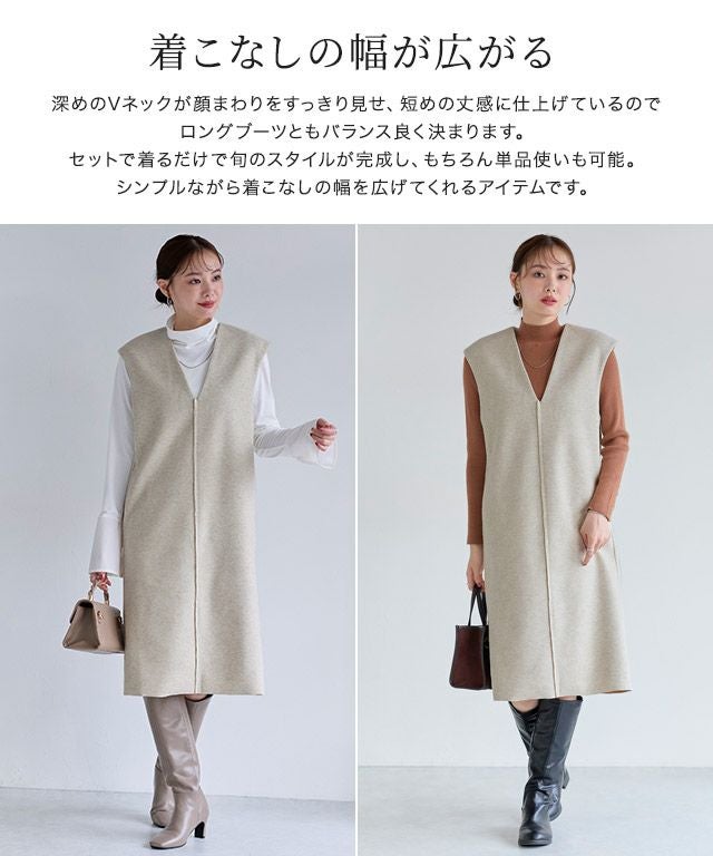 深めのVネックが顔まわりをすっきり見せ、短めの丈感に仕上げているのでロングブーツともバランス良く決まります。 セットで着るだけで旬のスタイルが完成し、もちろん単品使いも可能。 シンプルながら着こなしの幅を広げてくれるアイテムです。