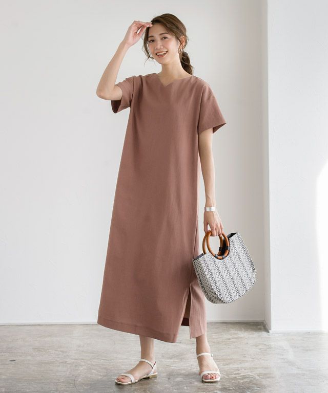 着丈はふくらはぎ下の丈感でした。サイドスリットがふくらはぎ上の辺りから入っています。袖丈は二の腕が隠れる丈感でした。脇口はちょうどよく、身幅はゆとりがあります。ファスナーなどはありませんが、着脱はスムーズにできました。やや薄手ですが透け感のない涼し気な生地です◎