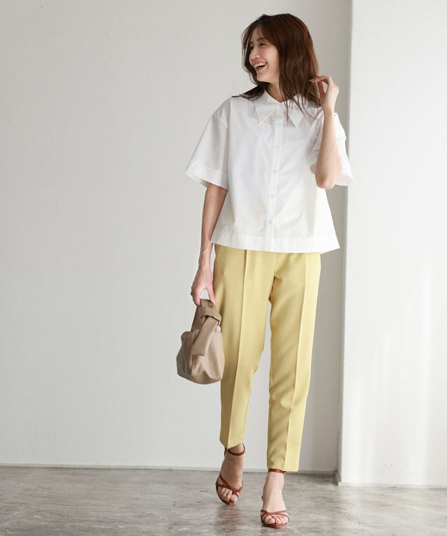 大きめの襟がアクセントになったブラウスと、ふんわり広がるフレアシルエットが女性らしいスカートのセットアップ。セット着用でワンピース見えする女性らしいアイテムです。それぞれ単品でも楽しめ、着回しの幅が広がります。