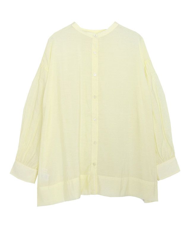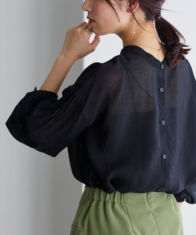 前後着用可能な2WAY仕様で、異なるデザインを楽しめる一枚。ブラウスとしてはもちろん、前を開けて軽い羽織りとしても活躍します。落ち感のあるボリュームスリーブが上品な印象をプラスしてくれます。