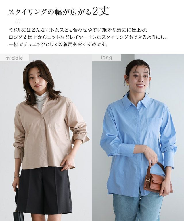 ミドル丈はどんなボトムスとも合わせやすい絶妙な着丈に仕上げ、ロング丈は上からニットなどレイヤードしたスタイリングもできるようにし、一枚でチュニックとしての着用もおすすめです。長めのカフスと胸ポケットがスタイリングに程良いアクセントをプラス。長めのカフスは折って、袖から覗かせても◎シンプルに仕上げ、シーンや気分によってスタイリングの幅が広がり、ワードローブに取り入れたい一枚です。