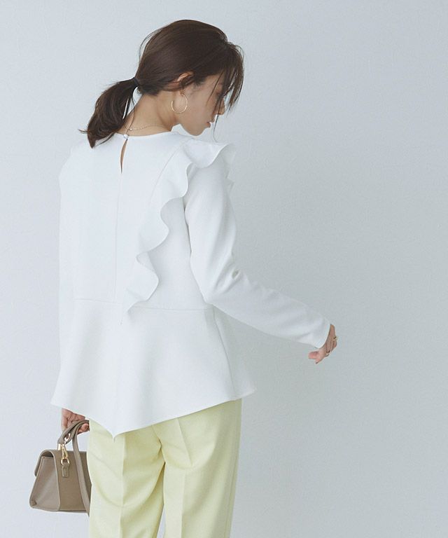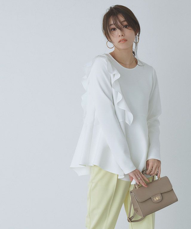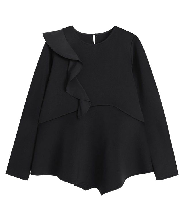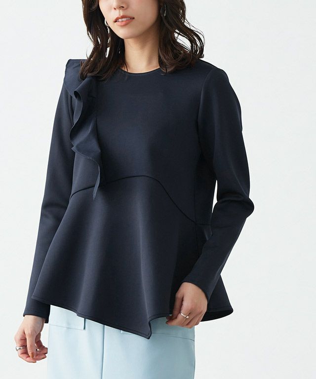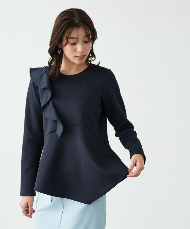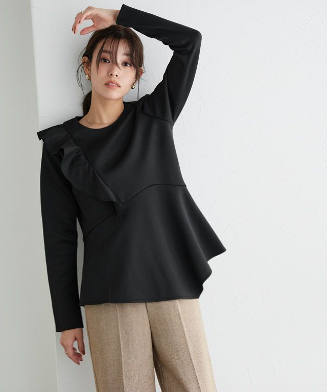 アシンメトリーにあしらったフリルデザインがスタイリングに華やかさとアクセントをプラス。身頃もフレアシルエットにすることで、体型カバーしながらもフェミニン感があるのも魅力です。