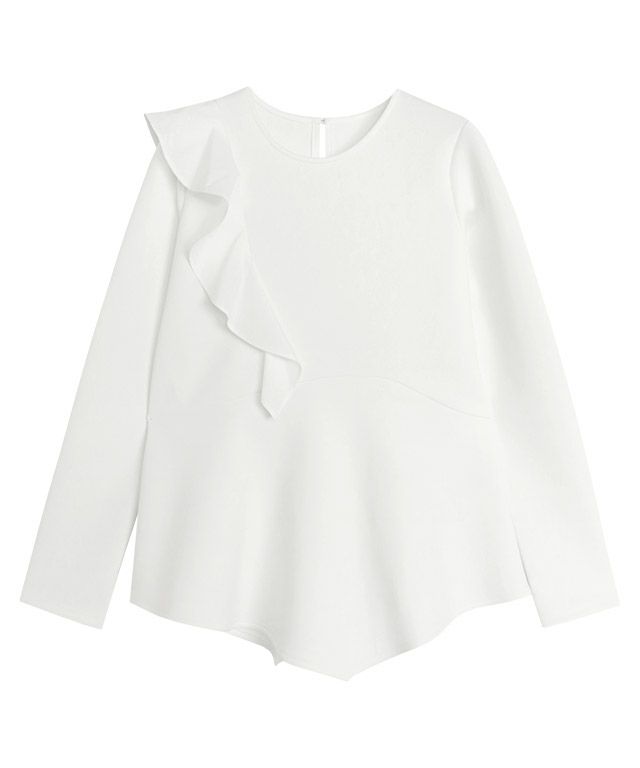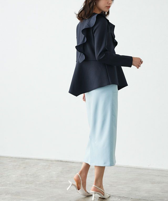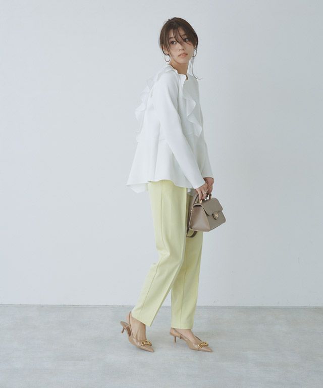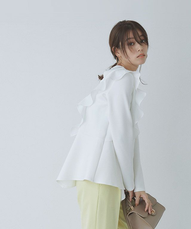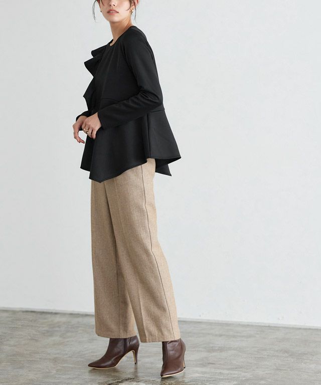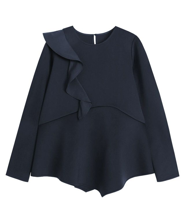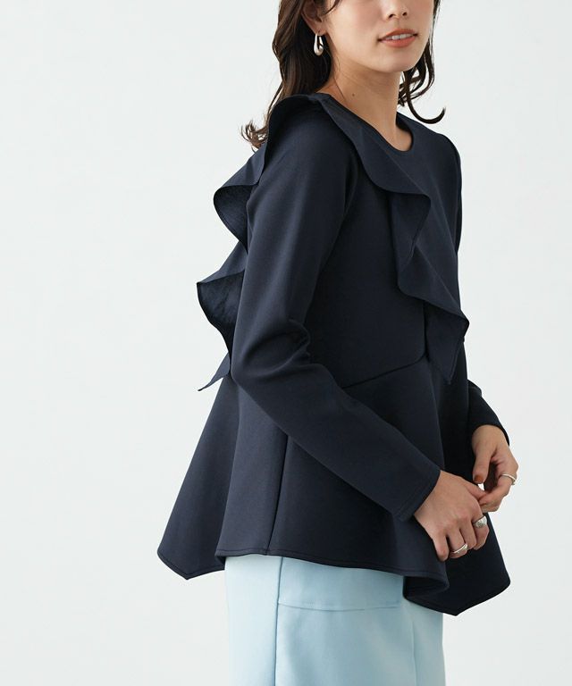 アシンメトリーにあしらったフリルデザインがスタイリングに華やかさとアクセントをプラス。身頃もフレアシルエットにすることで、体型カバーしながらもフェミニン感があるのも魅力です。