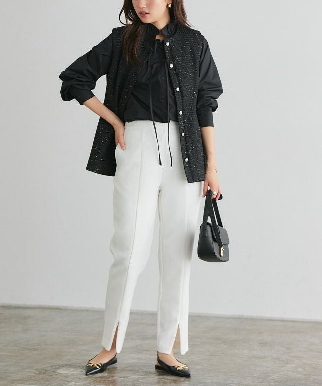 ラメ糸とスパンコールがMIXされたツイード素材がトレンドライクで華やかな印象に。派手すぎないラメなのでコーデに迷わず着回しやすいです。