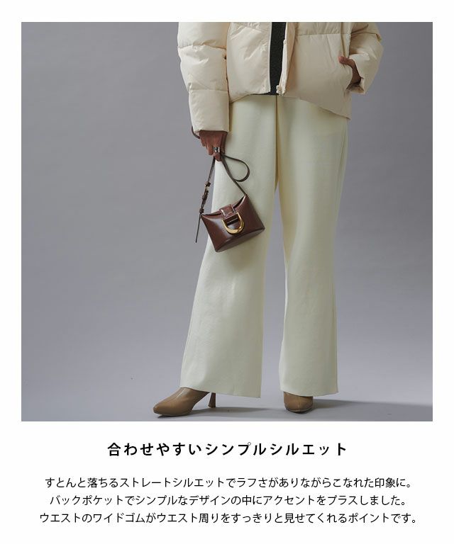 すとんと落ちるストレートシルエットでラフさがありながらこなれた印象に。バックポケットでシンプルなデザインの中にアクセントをプラスしました。ウエストのワイドゴムがウエスト周りをすっきりと見せてくれるポイントです。