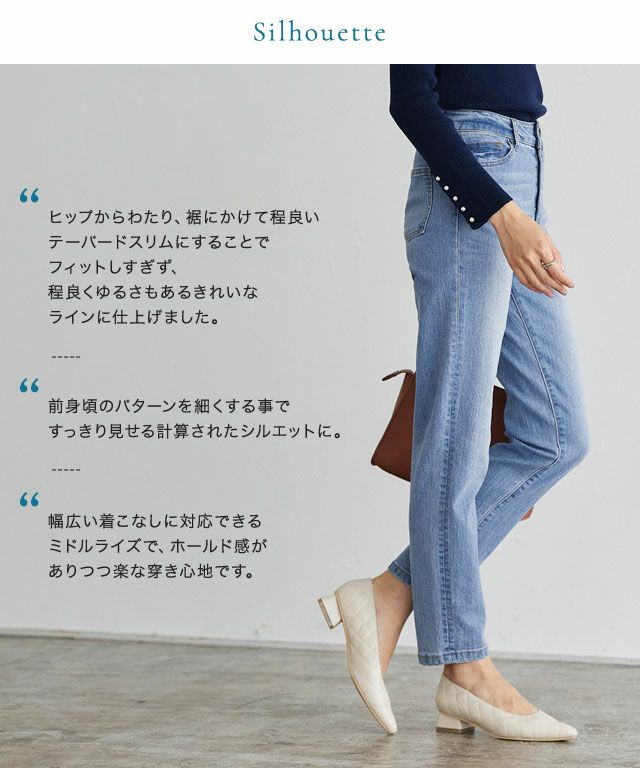 程良いゆるさで女性らしい美シルエットに“ストレッチスリムテーパードデニム”