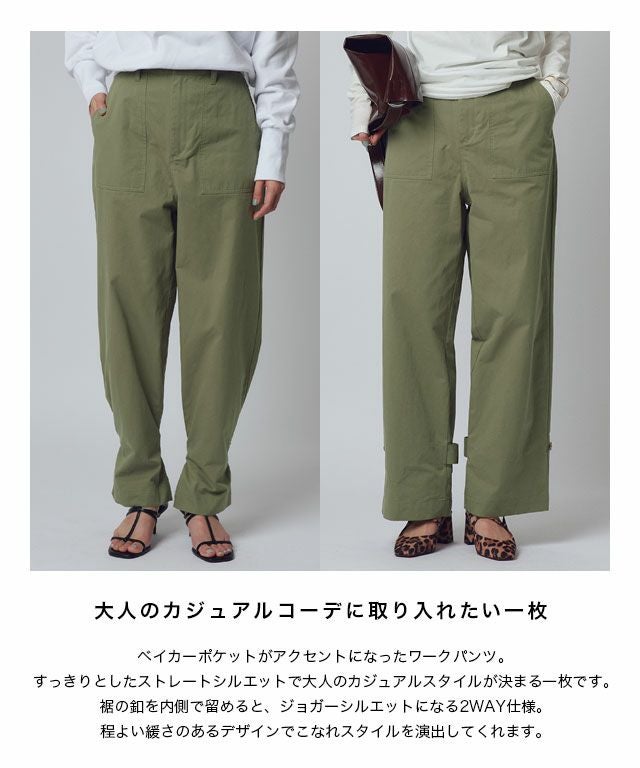 ベイカーポケットがアクセントになったワークパンツ。すっきりとしたストレートシルエットで大人のカジュアルスタイルが決まる一枚です。裾の釦を内側で留めると、ジョガーシルエットになる2WAY仕様。程よい緩さのあるデザインでこなれスタイルを演出してくれます。