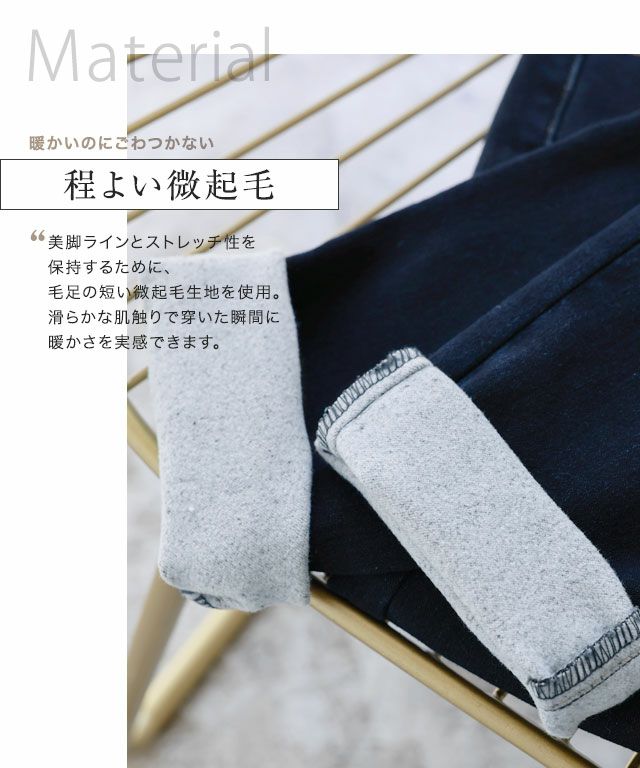 暖かいのにごわつかない「程よい起毛感」。美脚ラインとストレッチ性を保持するために、毛足の短い起毛生地を使用。滑らかな肌触りで穿いた瞬間に暖かさを実感できます。動きに合わせてぐんぐん伸びる高ストレッチ素材で、ストレスフリーな穿き心地を叶えます。