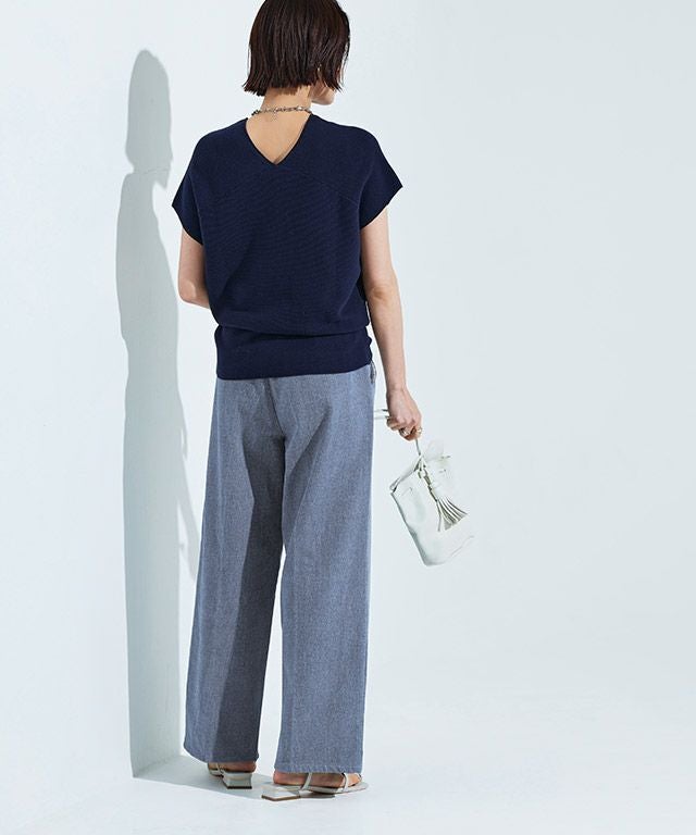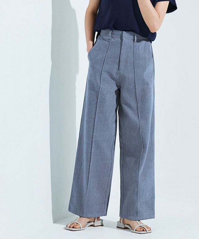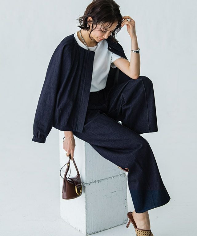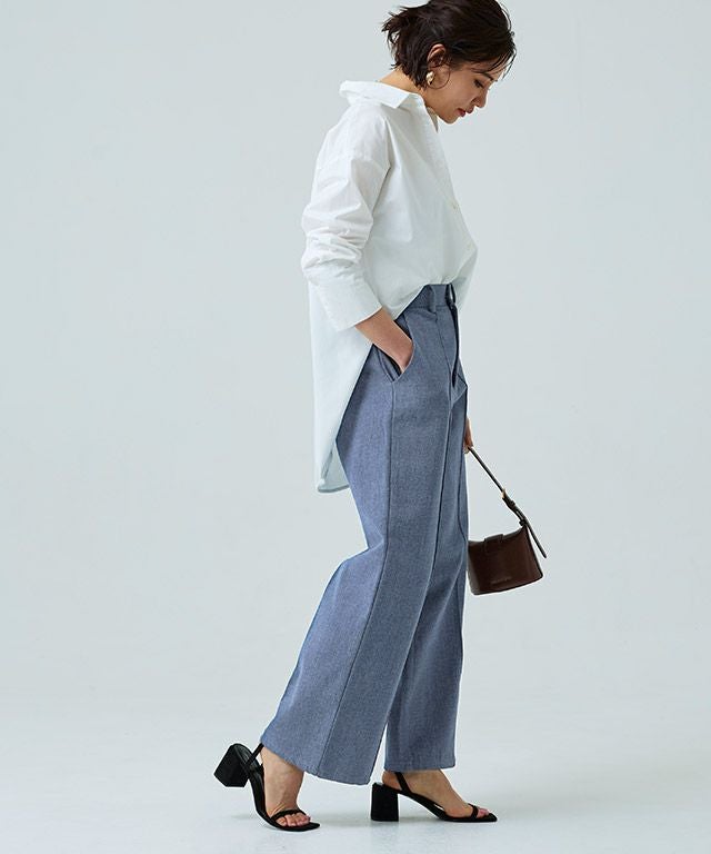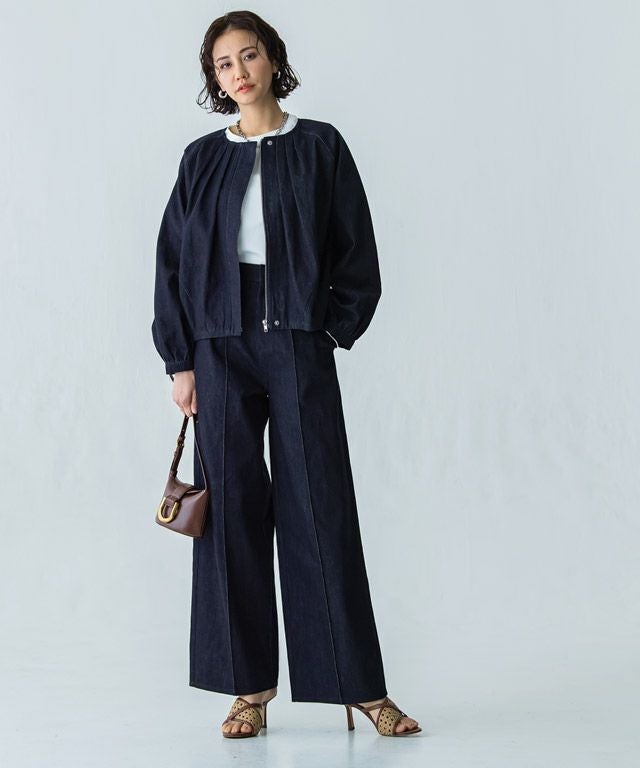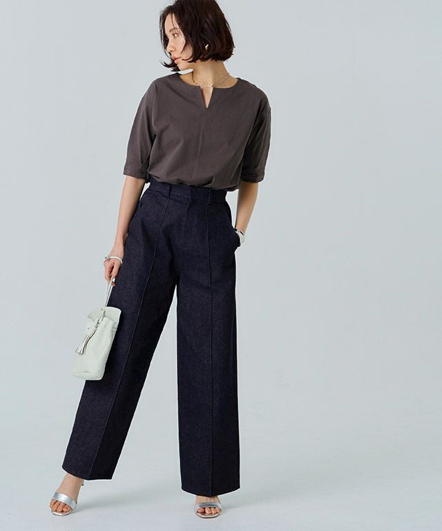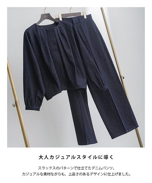 スラックスのパターンで仕立てたデニムパンツ。カジュアルな素材ながらも、上品さのあるデザインに仕上げました。センターのピンタックが足のラインをきれいに見せてくれ、きちんと感のある印象に。お洗濯で消えないところも魅力の一つです。すとんとしたストレートラインで落ち着いた大人な雰囲気へと導きます。