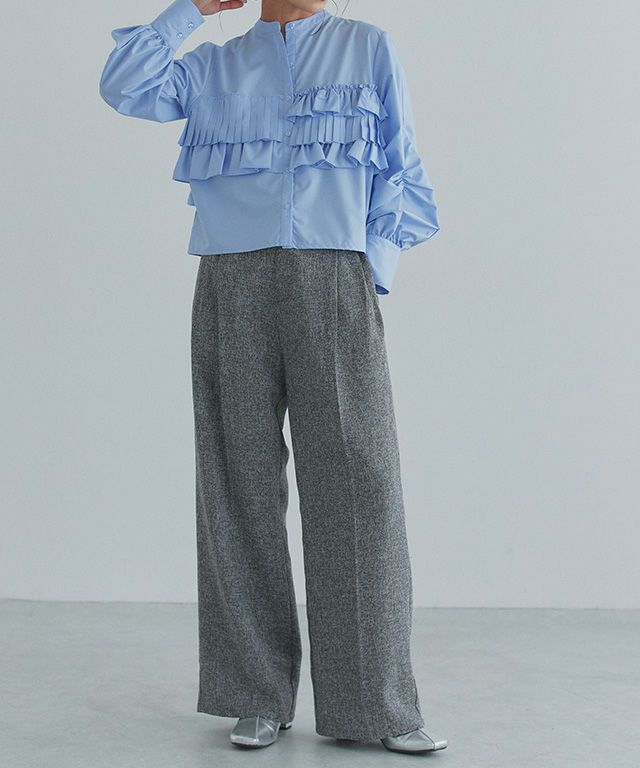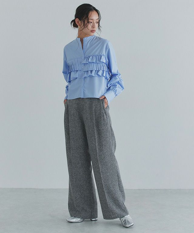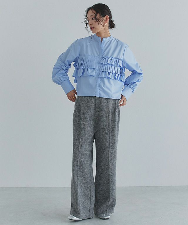 ドライタッチな肌ざわりと、こなれた雰囲気を演出するサマーツイード素材を使用。シワになりにくく、シルエットが崩れにくいため、美しいラインをキープできます。