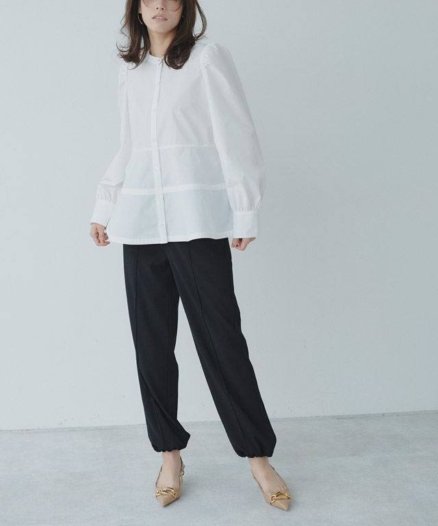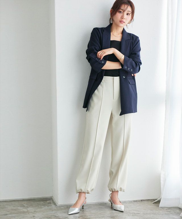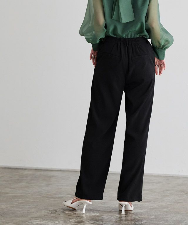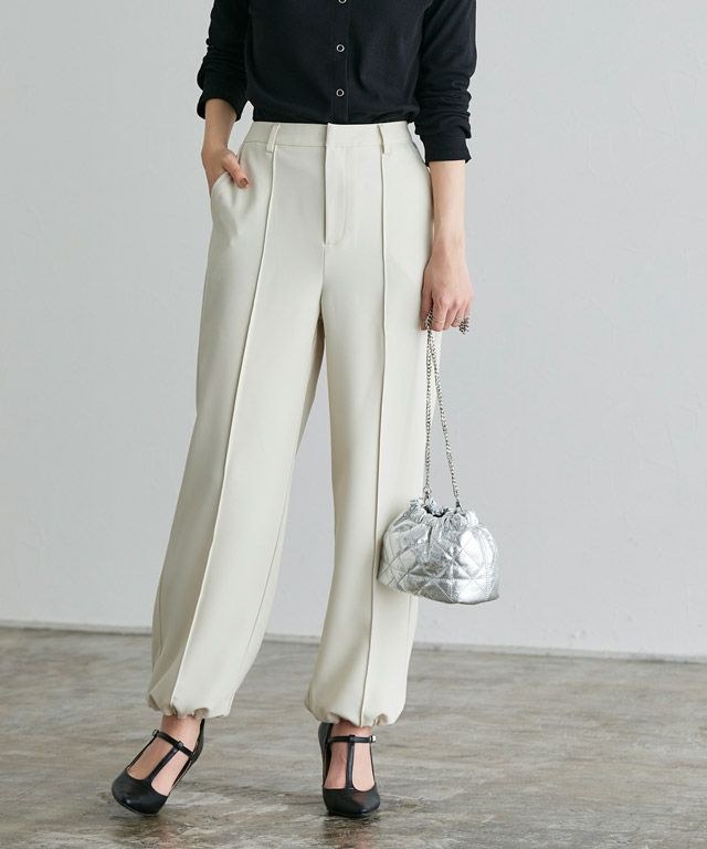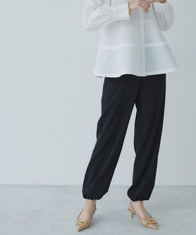 裾を絞らなければストレートシルエットで、きちんと見えを叶えるデザイン。裾のコードを絞るとシルエットを変えることができ、スタイリングを楽しむことができます。絞った際にコードが裾から出ない仕様もこだわりポイントの一つ。ON/OFFのスタイリングが楽しめます。