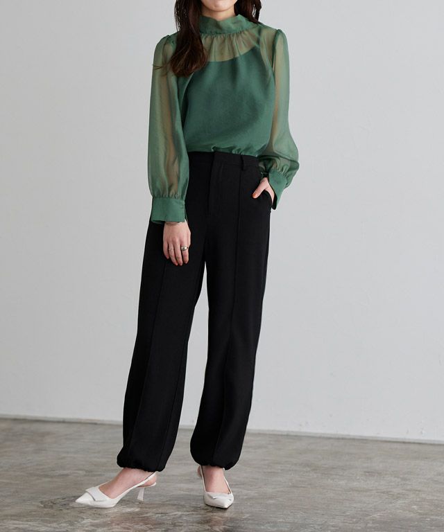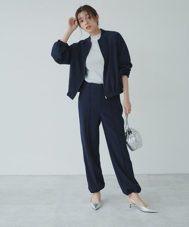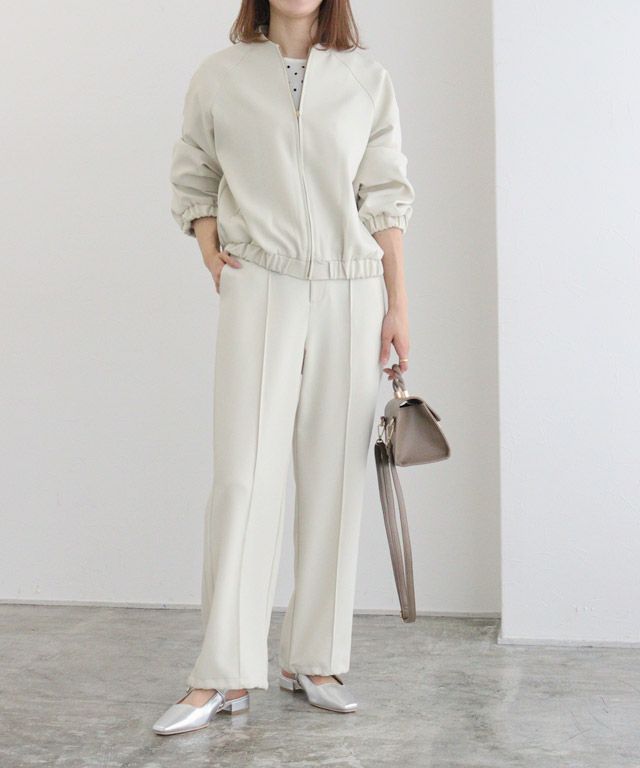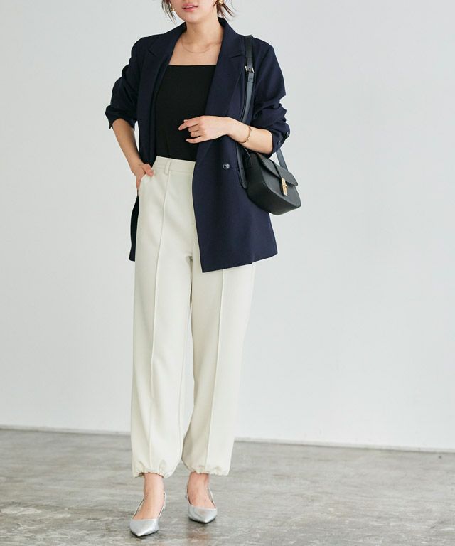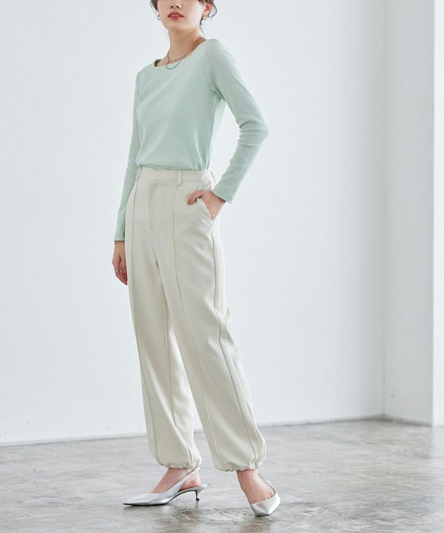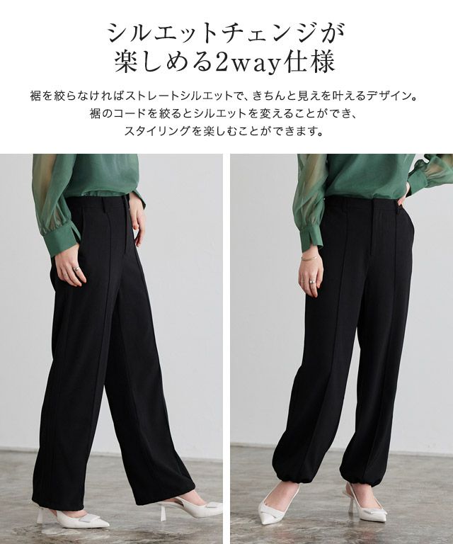 裾を絞らなければストレートシルエットで、きちんと見えを叶えるデザイン。裾のコードを絞るとシルエットを変えることができ、スタイリングを楽しむことができます。絞った際にコードが裾から出ない仕様もこだわりポイントの一つ。ON/OFFのスタイリングが楽しめます。