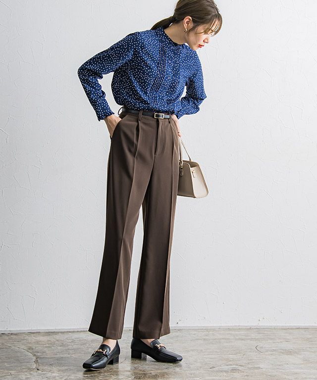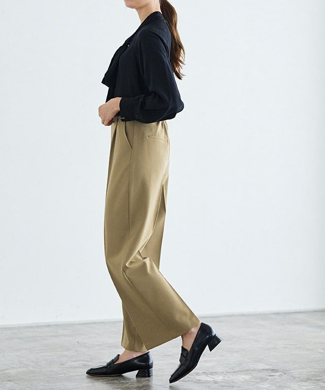 ウエストのタックがお腹周りをカバーし、裾まで入ったセンタープレスがすっきりとした印象に導きます。太すぎずストンと落ちるストレートシルエットがどんなアイテムとも合わせやすく、ON/OFF問わず着用頂けるアイテムです。同素材のジャケットやジレとセットアップでの着用もおすすめ。