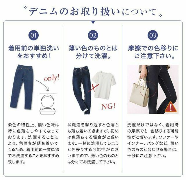 ※インディゴなどの濃いお色は他カラーより伸縮率が少なく、硬く感じる場合がございます。