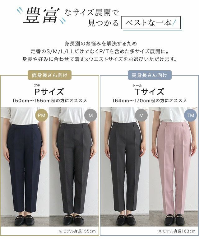 脚のラインをすっきりと見せてくれるテーパードパンツ。裾巾を少し広くすることでふくらはぎまわりのシルエットを拾いにくくしました。前後のセンタープレスがきちんと感を演出してくれる一枚。ジップ部分をフェイクカバーにすることでリアルパンツに近いデザインに。ウエストは後ろゴムで楽な穿き心地なのに前はフラットなのでインスタイルもすっきりときれい見えし、ベルトループ付きでウエストマークしたスタイリングもおすすめ。ON/OFF問わず合わせやすい一枚に仕上げました。