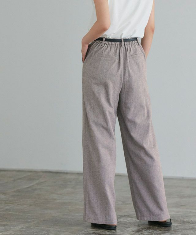 細かいヘリンボーン柄が、派手すぎない程良いアクセント◎タックやウエストギャザーでお腹周りはカバーしつつ、ルーズなシルエットがラフな印象に。トレンドライクなカジュアルスタイルにぴったりの一枚です。