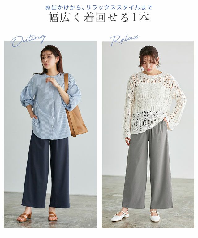 裾に向かって程よく広がるワイドラインにすることで、ワイドのデザインながらもスタイルUP効果も◎ウエストは紐付きで、簡単にサイズ調整が可能です。