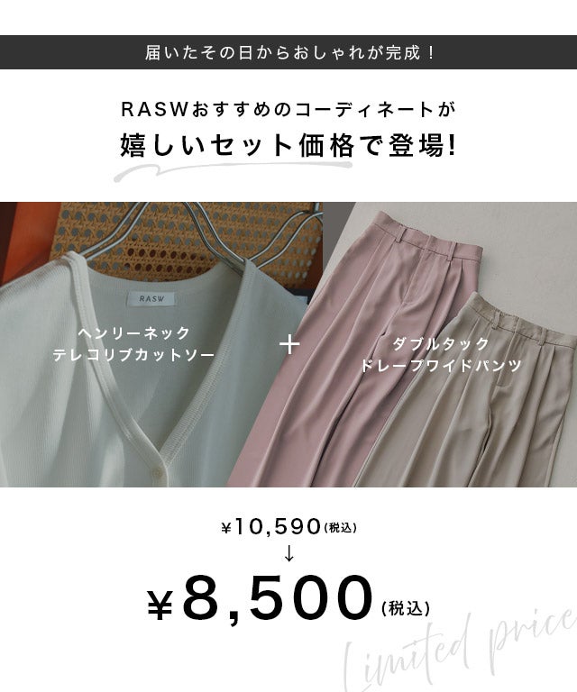 他の画像を見る #送料無料 #新作 在庫切れ 販売開始前です。 販売期間 2026/02/19 17:00 〜 [RASW]【コーデセット】テレコトップス×ワイドパンツset◆送料無料 ¥ 8,500 税込 お気に入りに登録する