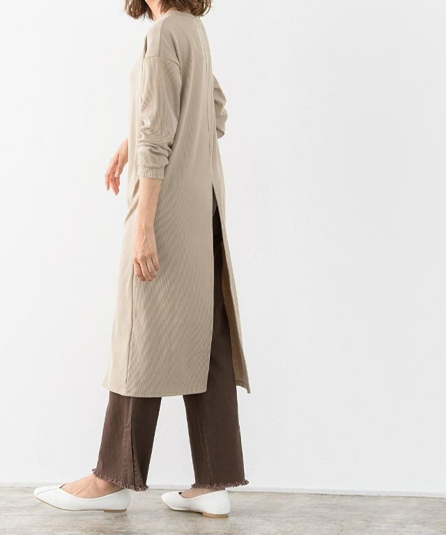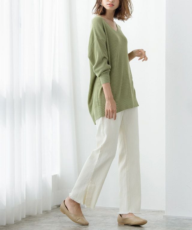 また、ニット製品は生産の過程上「生地を織る際の糸の継ぎ目」繊維の「混紡」、プレス加工、製品洗い加工によって形やサイズ(5cm前後)に誤差が生じる場合がございますが品質上の問題はございません。