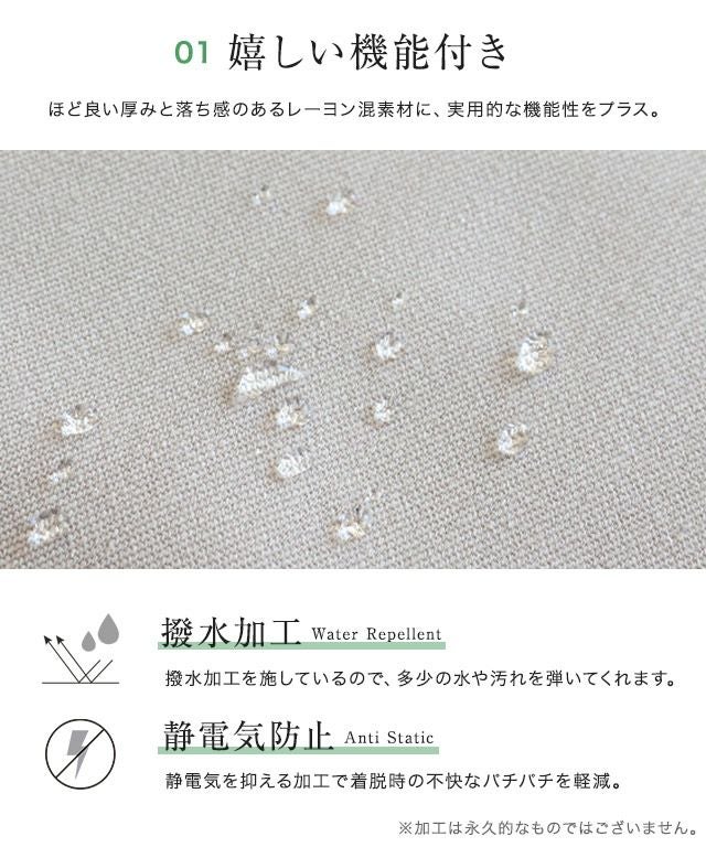 程良い厚みと落ち感のあるレーヨン混素材を使用し、大人な印象へと導きます。表面に撥水加工を施しているので多少の水や汚れを弾いてくれるところも嬉しいポイント。着脱時の静電もなりにくい加工をしているので不快感を軽減してくれます。