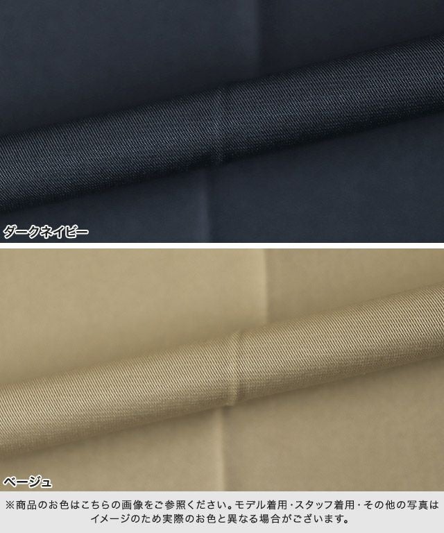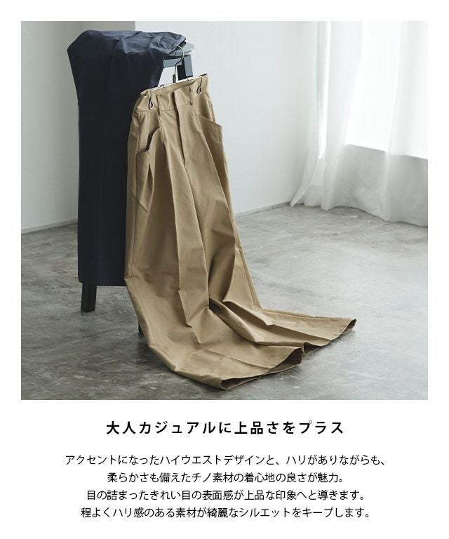 アクセントになったハイウエストデザインと、ハリがありながらも、柔らかさも備えたチノ素材の着心地の良さが魅力。目の詰まったきれい目の表面感が上品な印象へと導きます。程よくハリ感のある素材が綺麗なシルエットをキープします。