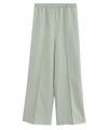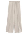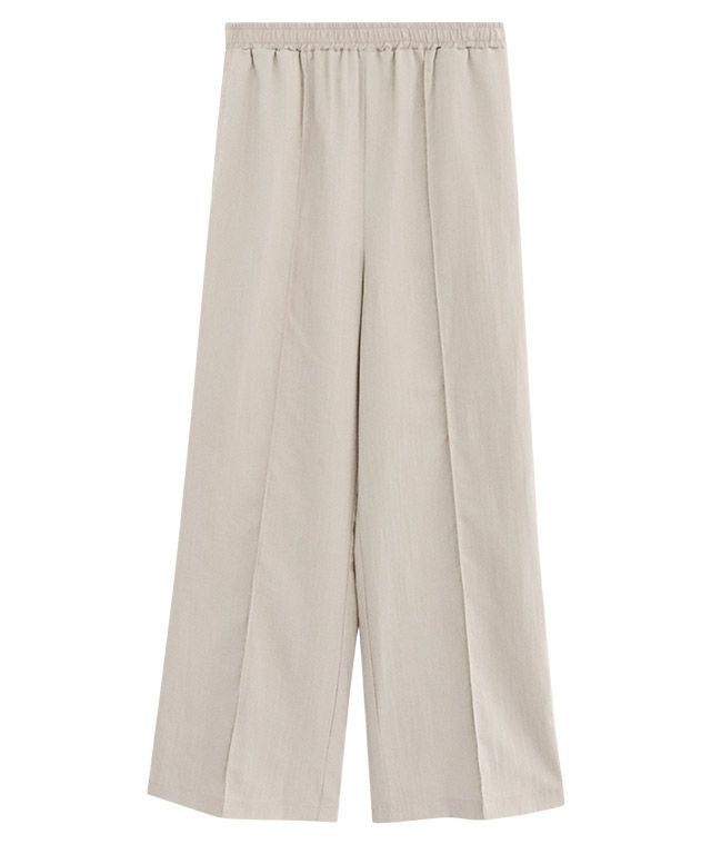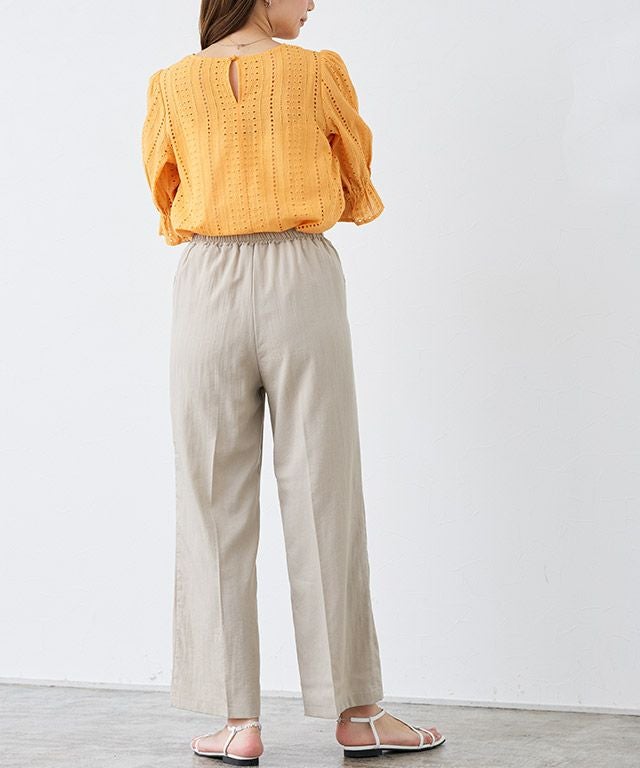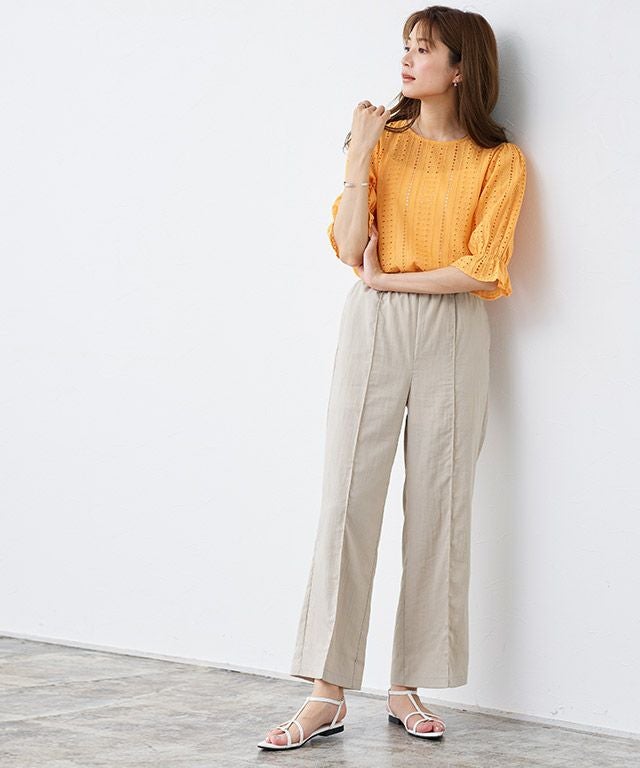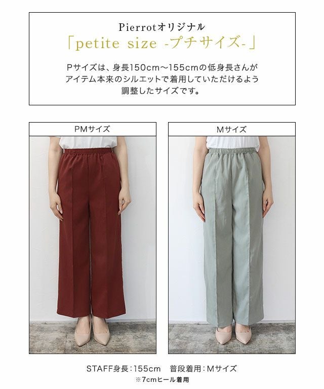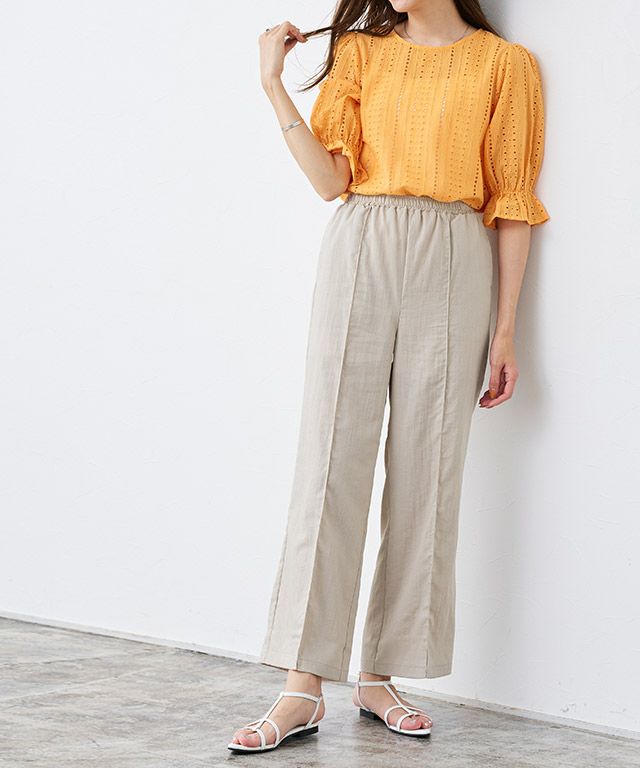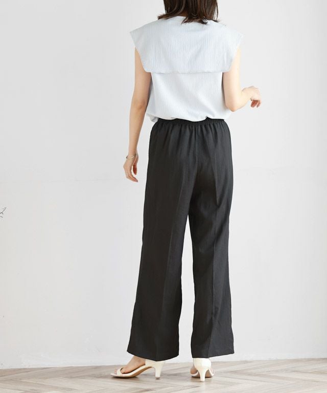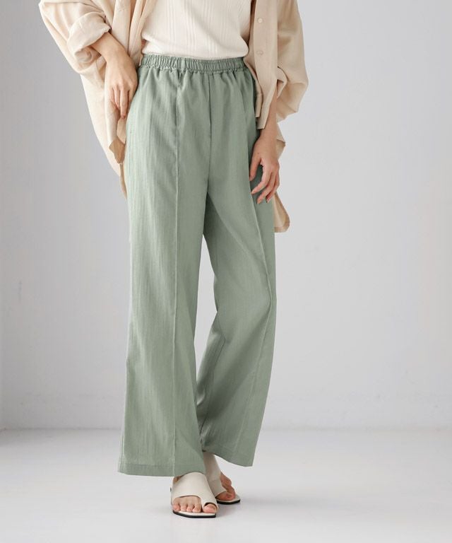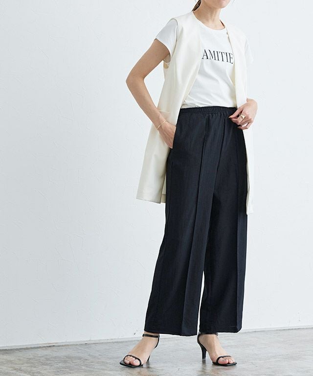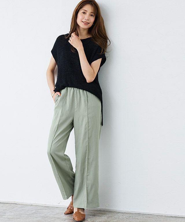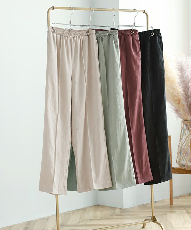 センターラインに洗濯しても取れにくいピンタックを施しているので、ゆるっと楽な着心地ながらきれいめなスタイルに見せてくれます。ウエストは総ゴム仕様でラクな穿き心地。