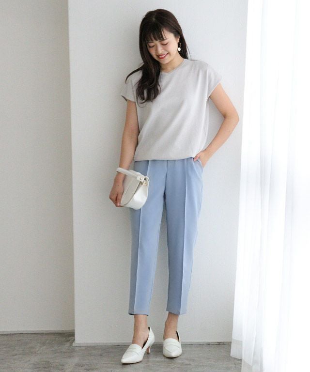 I 着丈は足首が見える丈感でした。ウエストはややゆとりがあり、ヒップには程よいゆとりがあります。脚周りは程よいゆとりがありました。さらっとしたきれいめな素材です。低身長でもクロップド丈なのですっきりと着用できます。