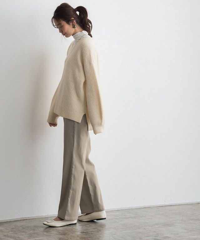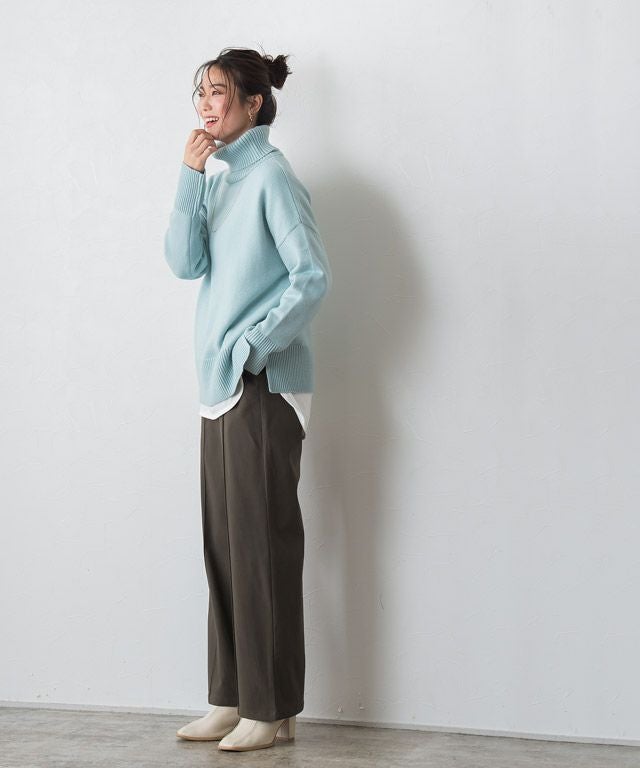 I 着丈は足首下の丈感でした。フラットシューズでは床につきます。全体的にゆとりあるサイズ感です。すとんとしたシルエットで脚のラインを拾いません。裏側が微起毛で肌触りの良い素材です。