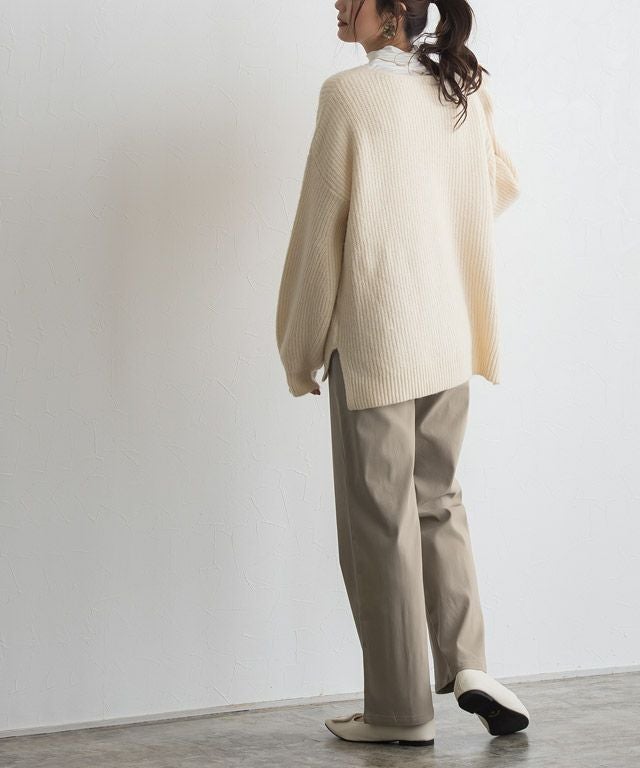また、ニット製品は生産の過程上「生地を織る際の糸の継ぎ目」繊維の「混紡」、プレス加工、製品洗い加工によって形やサイズ(5cm前後)に誤差が生じる場合がございますが品質上の問題はございません。