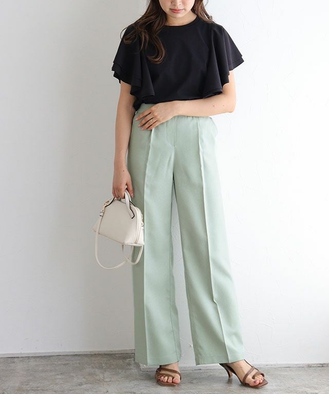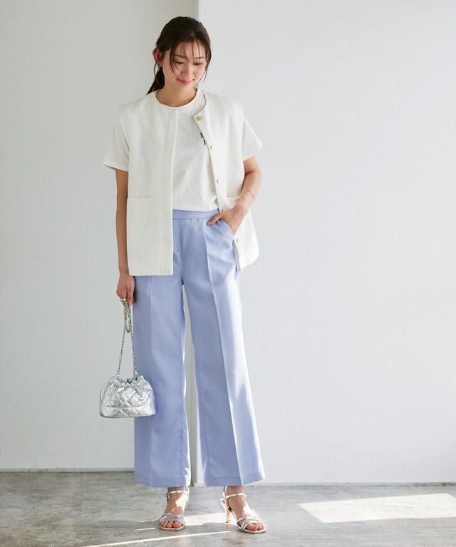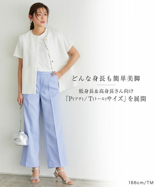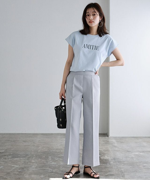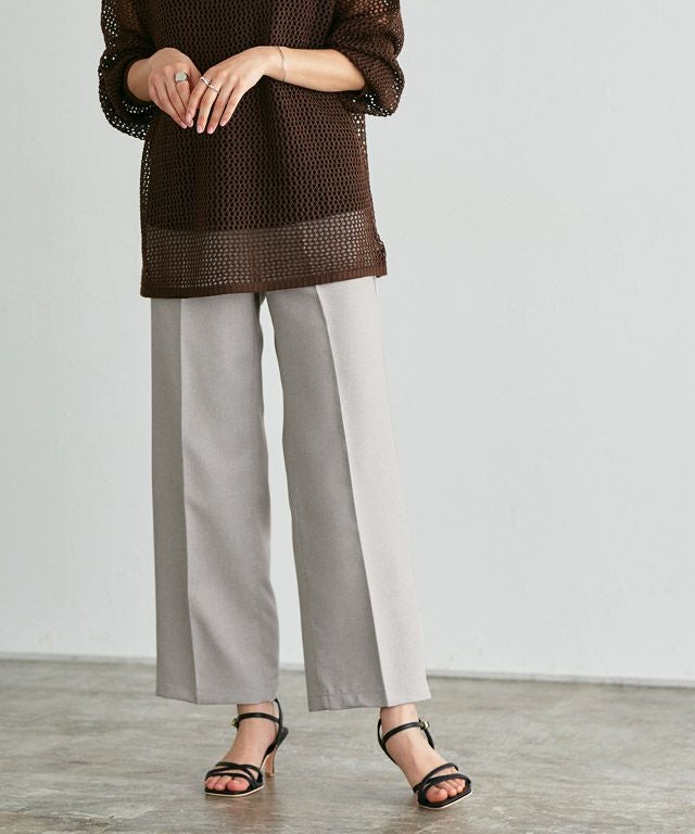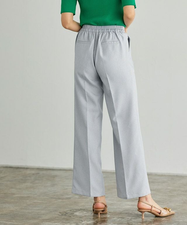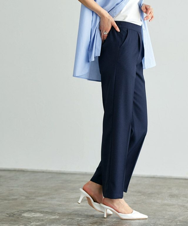 少しゆとりを持たせたストレートラインとセンタープレスで、すっきり見えするシルエット。脚のラインを拾いにくく、着回しやすいベーシックなデザインです。ウエストは着脱しやすいゴム仕様で穿き心地も快適です。ON/OFF使えて活躍する優秀アイテムです。