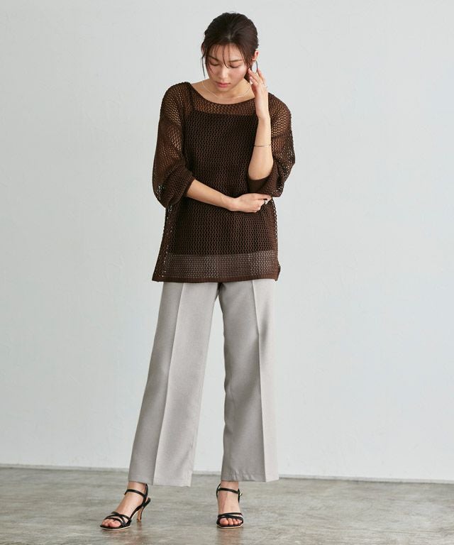 シャリッとした風合いが、リネンのような清涼感がありながら上品な印象に。接触冷感素材が暑い季節にぴったりな一枚。ポリエステル素材なので、お手入れが簡単なところも嬉しいポイントです。杢感が大人な雰囲気へと導き、おしゃれなこなれ感をプラスします。
