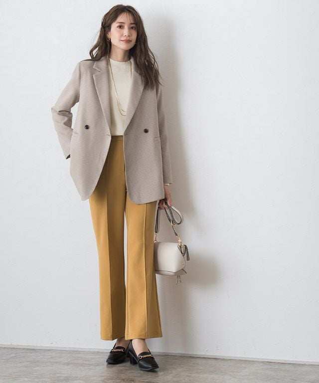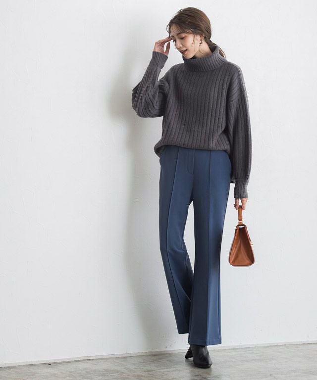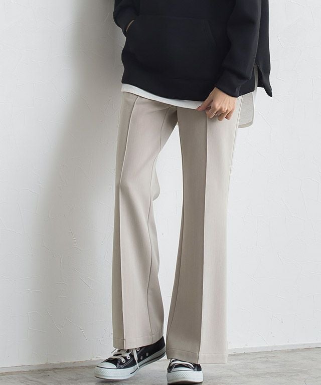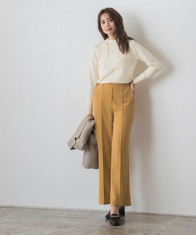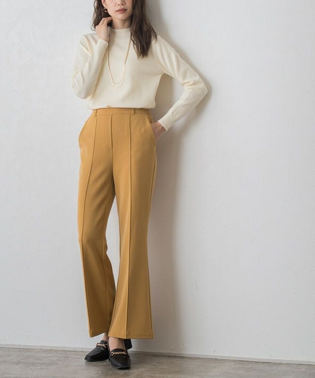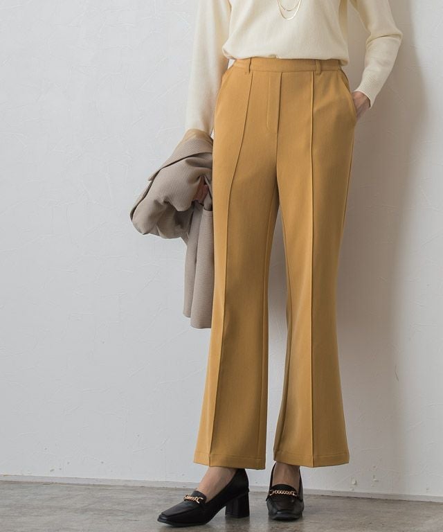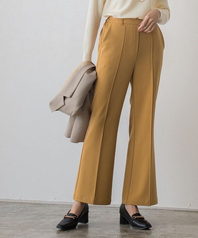 トレンドのセミフレアラインがシンプルコーデに鮮度をプラスしてくれるパンツ。フロントのピンタックと膝から広がるシルエットが、美脚見えする一枚です。