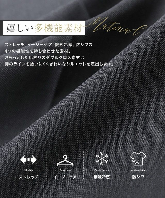 驚くほど伸びるストレッチ素材と接触冷感機能付きで夏でも快適に着ていただけます。程良い厚みとハリ感のある風合いが脚のラインを拾いにくくきれいなシルエットを演出してくれます。