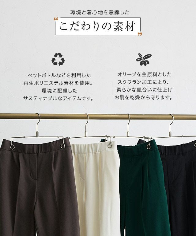 程よい厚みと落ち感のあるレーヨン混生地が高見えを叶え、内側には起毛加工を施しひんやり感を感じない暖かな穿き心地に。微起毛でシルエットに響くことなく、普段使いしやすいところが嬉しいポイント。リサイクル生地にスクワラン加工を施し、環境にも着心地にもこだわった素材です。