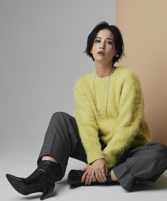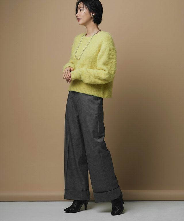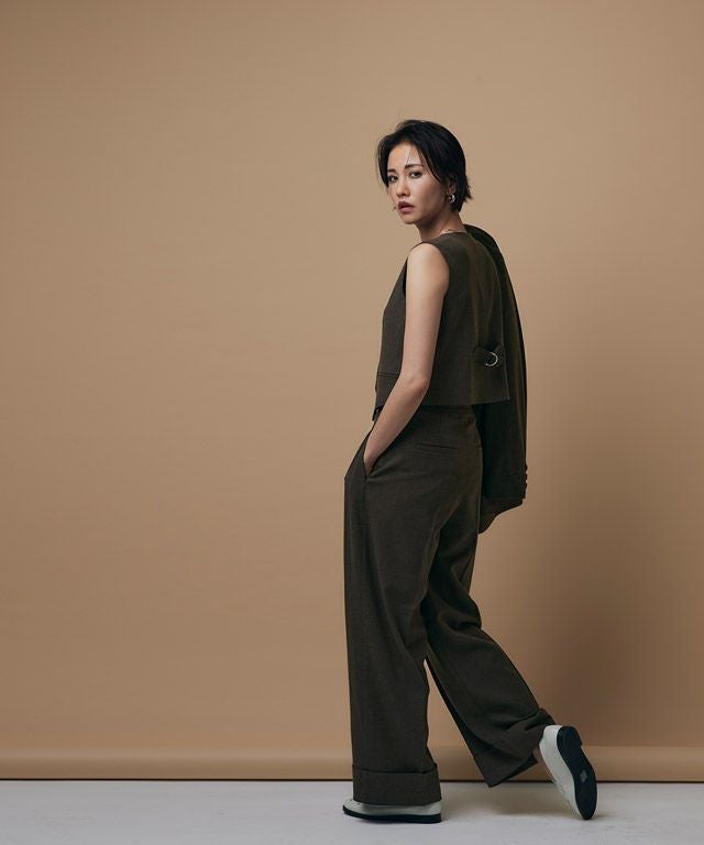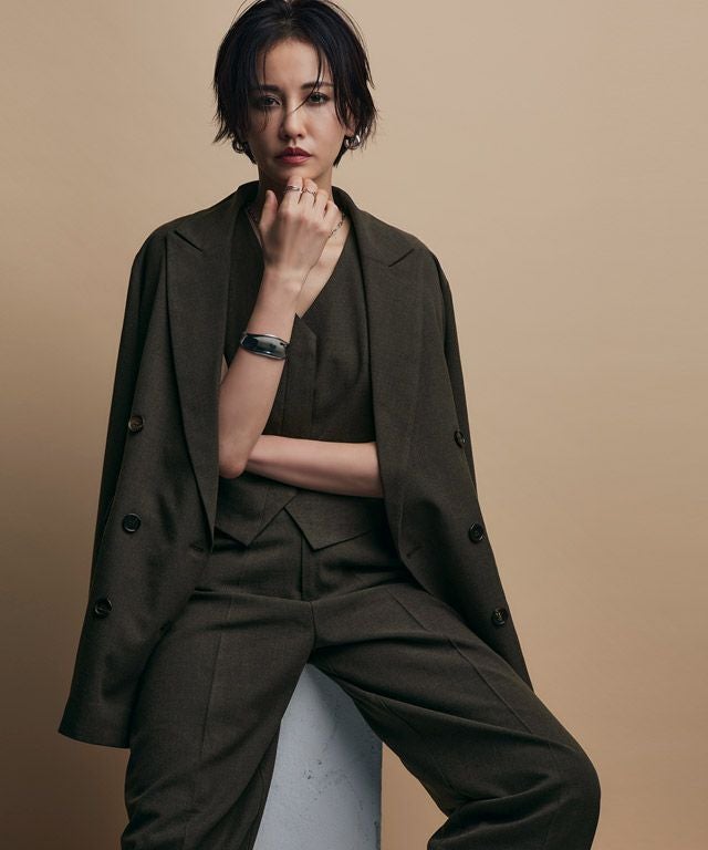 滑らかな肌触りと表情のある杢の風合いが高級感溢れる素材。程良いハリ感が綺麗なシルエットを作り出します。ウール特有の光沢感が上品な印象へと導きます。