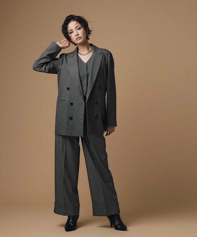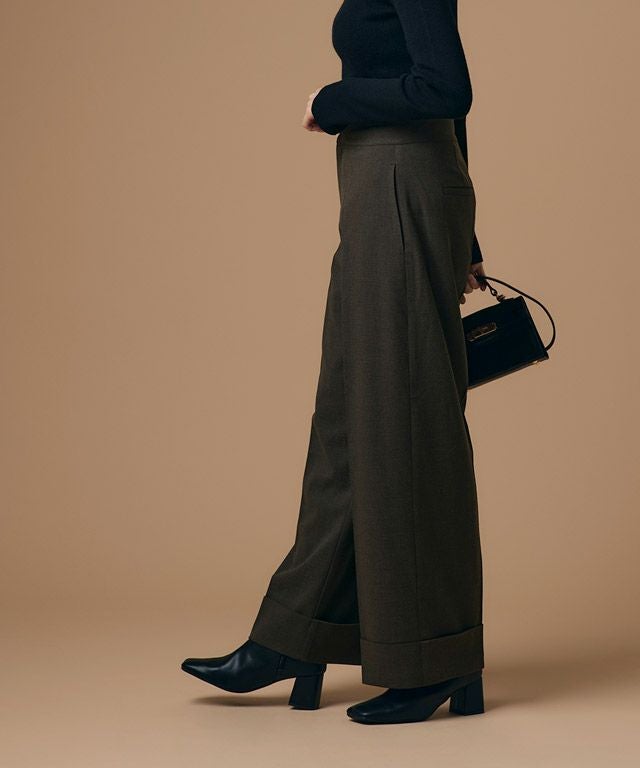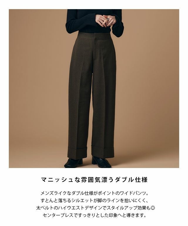 メンズライクなダブル仕様がポイントのワイドパンツ。すとんと落ちるシルエットが脚のラインを拾いにくく、太ベルトのハイウエストデザインでスタイルアップ効果も◎センタープレスですっきりとした印象へと導きます。