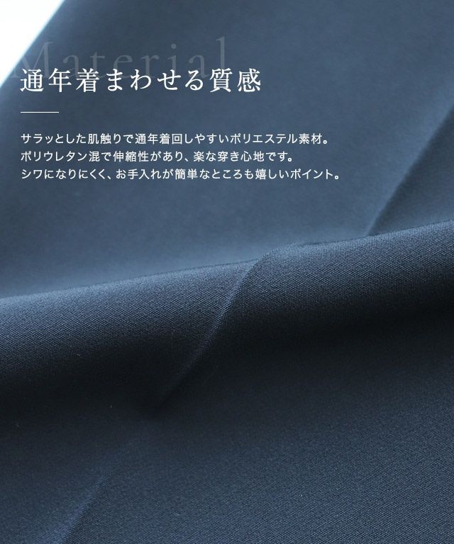 サラッとした肌触りで通年着回しやすいポリエステル素材。ポリウレタン混で伸縮性があり、楽な穿き心地です。シワになりにくく、お手入れが簡単なところも嬉しいポイント。