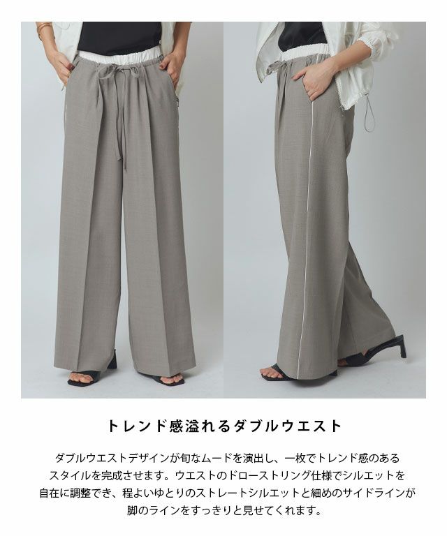 ダブルウエストデザインが旬なムードを演出し、一枚でトレンド感のあるスタイルを完成させます。ウエストのドローストリング仕様でシルエットを自在に調整でき、程よいゆとりのストレートシルエットと細めのサイドラインが脚のラインをすっきりと見せてくれます。