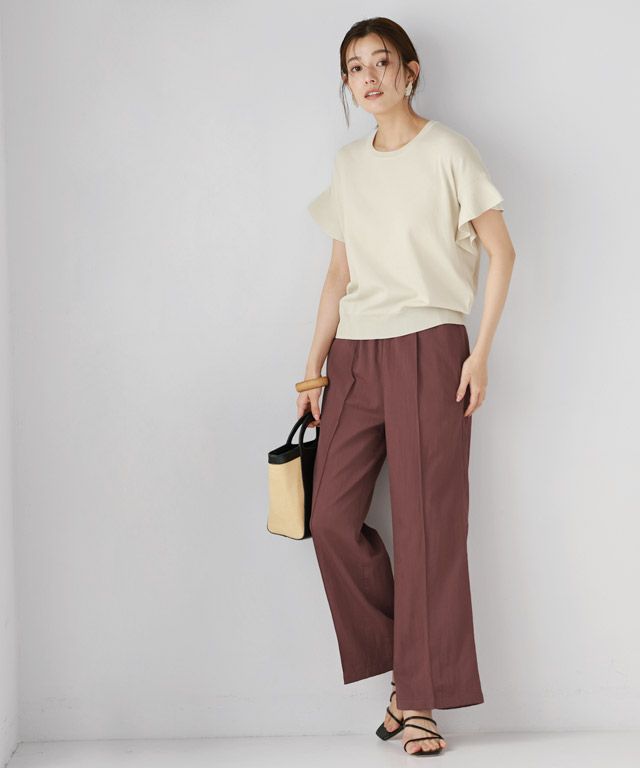 センターラインに洗濯しても取れにくいピンタックを施しているので、ゆるっと楽な着心地ながらきれいめなスタイルに見せてくれます。ウエストは総ゴム仕様でラクな穿き心地。