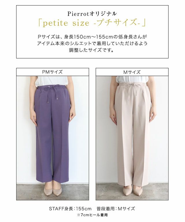 着丈は足首下で裾が床に付いてしまう丈感でした。ウエストはややゆとりがあり、ヒップにはゆとりがあります。脚周りはゆとりがありました。程良くハリ感がありきれいめな表面感です。伸縮性のある素材で履き心地が良いです。